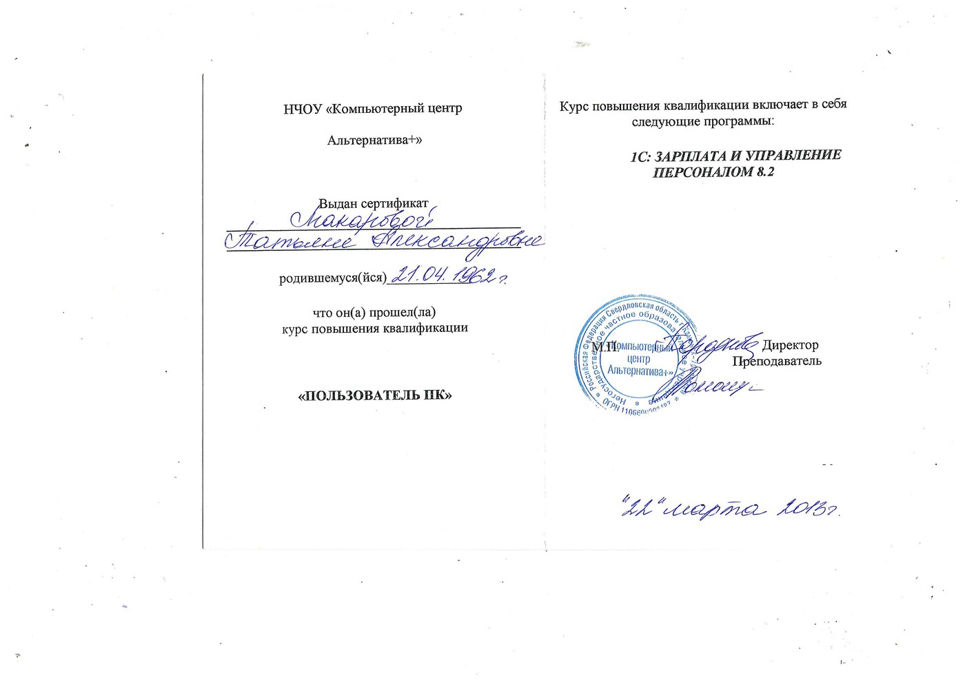 Учебный центр «Альтернатива» 1С "Зарплата и Управление персоналом"
